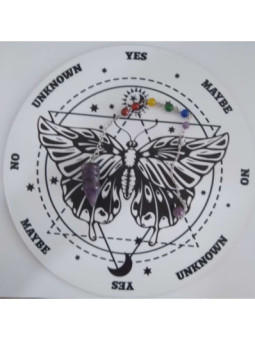 Péndulo Mineral con cadena Chakras +Tablero Redondo de Madera, blanco con Mariposa de 27.2cm aproximado de Diámetro para realizar Preguntas al Péndulo